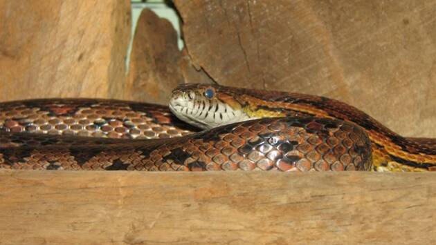 Питомцы отогнали змею, и хозяйка накрыла ее большим пластиковым контейнером. Прибывшие по вызову женщины спасатели определили, что в ее квартиру пробрался маисовый полоз. Эта змея неядовита. Они забрали ее с собой.