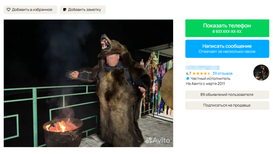 На популярном сайте найдено объявление от шамана в шкуре медведя из Новокузнецка, предлагающего решить всевозможные проблемы с помощью духовной магии.