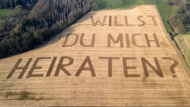 Немецкий фермер сделал предложение руки и сердца размера XXL на сельскохозяйственном поле с помощью трактора, пишет Bild. Паскаль Леккер, 25-летний фермер из Нижней Саксонии, решил сделать своей девушке предложение, от которого она не смогла бы отказаться. Он вспахал 12 гектаров земли и, прицепив к трактору культиватор, оставил на поле вопрос для будущей жены: "Ты выйдешь за меня замуж?". Это послание, написанное огромными буквами на одном из склонов в районе Везерской возвышенности, можно легко прочитать с высоты птичьего полета или холма, находящегося на расстоянии пяти километров. Именно туда Паскаль привез свою 24-летнюю подругу Лизу Нойберт. Молодой человек рассказал, что девушке потребовалось некоторое время, чтобы разглядеть буквы вдалеке и понять, что они предназначались ей. Тогда фермер наконец опустился перед Лизой на колени и еще раз задал тот самый вопрос. "Она была совершенно ошеломлена, не ожидала этого и сказала "да"", — рассказал счастливый жених. Он отметил, что идея пришла к нему три месяца назад, и за это время он составил программу управления трактором, используя спутниковые снимки и данные GPS. Теперь гигантские буквы будут видны до самого сбора урожая, особенно в сырую погоду.