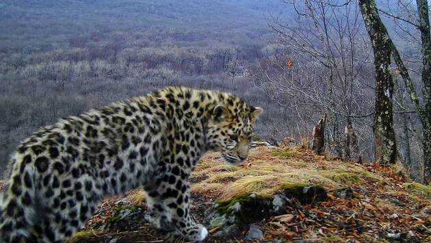 Котенок дальневосточного леопарда подождал мать с охоты и неожиданно попал в фотоловушку. Кадр с ним публикует дирекция заповедников «Земля леопарда» в своем Telegram-канале.