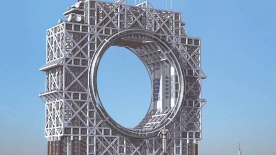 Академик Юрий Платонов разработал 40-этажное здание для площади Гагарина — конструкция с зеркальными фасадами в центре имела круглый проем. В нем бы курсировали высокоскоростные лифты.
