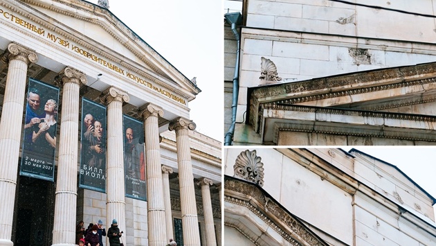 Роковым днем стало 14 октября 1941 года. Ударной волной от разорвавшейся фугасной бомбы во дворе бывшей усадьбы Голицыных разбило стеклянную крышу Пушкинского музея. Сорвало и железную кровлю, а металлические переплеты окон вдавило внутрь. Без кровли остались часть залов музея. Зима в тот год наступила рано и была холодной, поэтому музейные работники устраивали печи для обогрева экспонатов, не отправленных в эвакуацию. Со временем стеклянный световой купол воссоздали. А вот раны на стенах строения так и не залечили. Издали на светлом фасаде здания их незаметно. Но если приглядеться, то щербины обнаружишь и на колоннах, и на стенах, и на портике. В 2015 году установили памятную табличку, повреждения находятся примерно на 12 метров выше от нее.