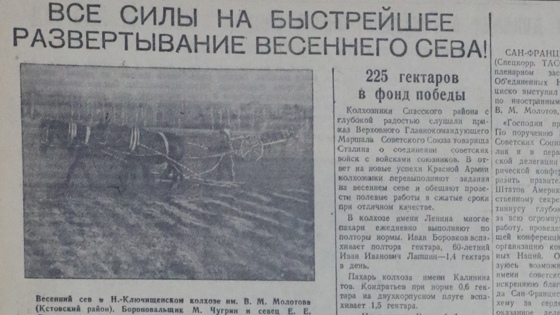 В Горьковской области продолжают отмечать встречу войск Красной Армии и союзников на Эльбе. 29 апреля 1945 года газета «Горьковская коммуна» публикует обращение Героя Советского Союза Петра Кузьмича Спикина. «Красная Армия и войска наших союзников рассекли фронт немецких войск и соединились в центре Германии», — говорится в нём. Герой рассказывает, что «тоже дрался за приближение этого дня» и даже в самых тяжёлых условиях «твёрдо знал, что великий Сталин приведёт нас к победе». Пётр Спикин призвал трудящихся Горьковской области работать ещё самоотверженнее. Спикин получил звание Героя Советского Союза в возрасте 25 лет. К сентябрю 1943 года он в звании гвардии старшего лейтенанта командовал дивизионом воздушно-десантного артиллерийского полка. Спикин отличился во время битвы за Днепр. Сражался, несмотря на тяжёлое ранение. В 1944 году он был уволен в запас и стал жить в Горьком. Работал в обкоме партии. На селе тем временем начался сев, и в Бутурлинском районе колхозная молодёжь решила сверх плана засеять 52 гектара зерновых и картофеля из собственных запасов в фонд помощи детям фронтовиков. Сообщается, что инициаторами стали комсомольцы колхоза «Красная звезда». Стало известно, сколько денег и на что направят в Горьковской области в 1945 году. О бюджете рассказал первый секретарь обкома партии Михаил Родионов. Если в 1940 году в казне Горького и области было 484 млн рублей, то на 1945‑й бюджет принят в сумме 650 млн. Промышленность работает успешно – за 1944 год программа выполнена на 103,2 процента. А в колхозах за годы войны посевные площади выросли на 40 тысяч гектаров. «С особой силой, — говорится в докладе, — в бюджете отражена забота о детях и матерях». В области расширили сеть детских домов, и в них находятся 10265 человек. Выросло и число мест в детских садах – до 12373. А в школах число учащихся увеличилось с 460 тысяч в 1944 году до 508 тысяч. Михаил Родионов сообщил, что в Горьком и по области семьям военнослужащих и инвалидам войны в 1944 году выдано пенсий и пособий почти на 270 млн рублей. Родионов подчеркнул, что если в 1940 году на социально-культурные нужды пошло 352 млн рублей, то в нынешнем запланировано 462 млн, то есть больше на треть. На 15 млн рублей больше решено направить на здравоохранение. Вы тоже можете принять участие в наших проектах в годовщину 80-летия Великой Победы. Пишите нам в сообщения сообщества ВКонтакте. Расскажите о своих родственниках, которые воевали или трудились в тылу. Расскажите всем о том, как они в невероятных условиях приближали победу. К письму можно приложить выдержки из писем, документов и фотографии.