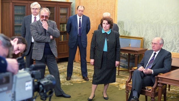 Я просто видела это по его глазам. Последняя наша поездка с ним была в Вашингтон. Это был май 1991 года. Раиса Максимовна улетела на вертолете с Барбарой Буш на какое-то мероприятие. Я зашла к нему перед съемкой, воротник поправить, припудрить, мы же гримеров с собой не брали. Все сами делали. Вижу, на нем лица нет, бледный как полотно.