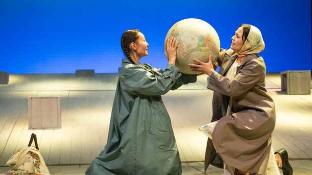 Понятно, что сценическими средствами передать то, что происходит в дороге, - задача непростая. Тут пригодился синтез искусств - театрального и кинематографического. То, что происходит в дороге, - это кино, которое демонстрируется на экране, а все остальное происходит на сцене, где, к слову, минимум декораций и реквизита.
