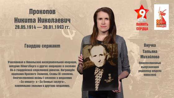 «Герои не умирают, пока жива о них память… Я благодарна акции «Память сердца за возможность внести свой маленький вклад в важное дело сохранения памяти о Великой Отечественной войне. Рада, что фронтовая история моего дедушки будет услышана, вновь засияет светом подвига спустя 80 лет. Юбилейная дата повод для всех порыться в семейных архивах, стряхнуть с них пыль времен и в очередной раз напомнить миру о Великой Победе, добытой нашими предками горькой ценой. В наши дни идет война за ценности, очень хочется сохранить и приумножить те ценности, за которые воевал мой дедушка и которые остаются важными для нашей семьи любовь к родине, справедливость, человеколюбие.
