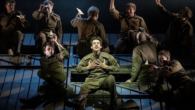 В финале поэма вернется к тому, с чего началась: на беленом брусе, что вытянулся на тросах по всей ширине сцены, рядом с милыми барышнями сидит весь мужской состав «Теркина». Задумчиво так курит. А чуть впереди — автор «Теркина» (Карэн Бадалов) произносит, пожалуй, самые важные строки: