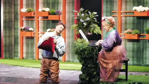 Эскиз по пьесе Александра Островского поставила на лаборатории в начале сезона Ирина Васильева, выпускница Сергея Женовача. В той версии молодой чиновник Бальзаминов был так и не выросшим ребенком на трехколесном велосипеде. К премьере образ лишился такой прямолинейности в трактовке, но и ясности в нем тоже поубавилось. Пространство на сцене осталось идиллическим и как будто не вполне реальным (художник Нина Юнгвальд-Хилькевич). Зеленый газон, горшки с цветами, античные статуи и туи намекают, что перед нами если не сон, то мечта. Наивный фантазийный мир, в котором все слишком хорошо, чтобы быть правдой. Образы соответствуют месту. Первым на сцене появляется человек с медвежьей головой. Кажется, этот персонаж родился из фразы одного из героев пьесы о "дикой стороне, в которой могут жить только медведи да Бальзаминовы". Именно этот звериный образ сыграет ключевую роль в развязке. А пока на сцене общий танец (хореограф Виктория Фитюнина) в фатах, закрывающих лица. Выглядит это не менее экзотично, чем слово "фата" во множественном числе. Но этот спектакль весь скроен по принципу усиленной театральности и странным быть тоже не боится. Не боится он и разностильности. На сцене то и дело маячат фигуры в черном с покрытым трагическим гримом лицом. Больше всего они напоминают случайно "залетевших" в этот пестрый мир персонажей немого кино. В программке героини названы "вдовами". То ли в рифму к вдове Белотеловой, на которой Мишенька Бальзаминов собрался жениться. То ли как обозначение тех женщин, которым муж уже точно не светит. Ближе к финалу кухарка Матрена (Ольга Жукова), в этом спектакле очевидно влюбленная в Мишеньку, тоже окажется среди вдов. На этом фоне сюжет Островского, у которого о женитьбе мечтает мужчина, начинает звучать максимально прогрессивно. Главный герой Михайло Бальзаминов (Владимир Морякин), он же Мишенька, носит укороченные штанишки и видит сны наяву. В спектакле отчетливо видны границы разных реальностей, но не всегда можно сказать, где тут сон, а где явь. Будто каждое измерение в той или иной степени - сновидческое. Маменька (Влада Филиппова) - романтик и сибарит не меньше сына. Играет на фортепьянах (синтезатор надежно спрятан в густой зелени), носит легкомысленную тюлевую юбку и цветочки в прическе, долго спит и не меньше, чем Мишенька, любит пересказывать сны. В общем, яблонька под стать своему яблочку. Активная сваха Акулина (Алина Василенко) тоже выглядит кокетливо и по-девичьи, носит цветочки в волосах и серебристые туфельки. Что не мешает ей выпивать с клиентками (это по Островскому) и акробатически переползать на сцену из директорской ложи. Если все названные выше персонажи одеты хоть в какой-то степени исторически, то сестры Пеженовы (Наталия Прокопенко и Анастасия Ермилина) в своих ярких колготках и стильных черных пиджаках словно вчера сошли с подиума. Что недалеко от истины. Взаперти за электрозабором (какой еще может быть у этой золотой молодежи?) девиц держат не просто так, а за слишком веселую юность. С этого забора и начинаются главные странности. После эффектного полета в соседний двор к Белотеловой (настолько эффектного, что пришлось даже использовать куклу актера) Мишенька знакомится с уморительно флегматичной вдовой (Юлия Горелова). И начинает фантазировать, как бы жениться на ней и на одной из Пеженов