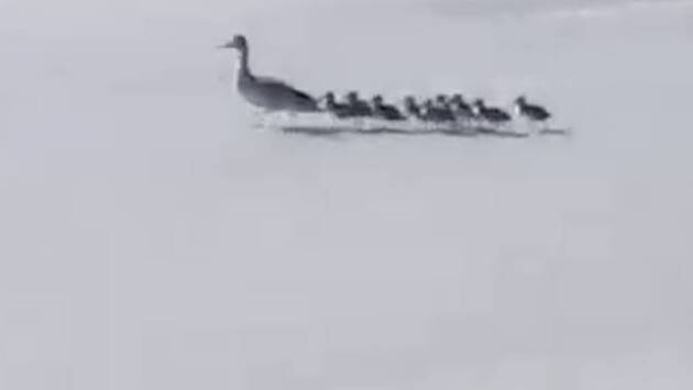 Мать-утка перевела семейство через оживленную дорогу в Омске. Видео публикует Telegram-канал Mash Siberia.