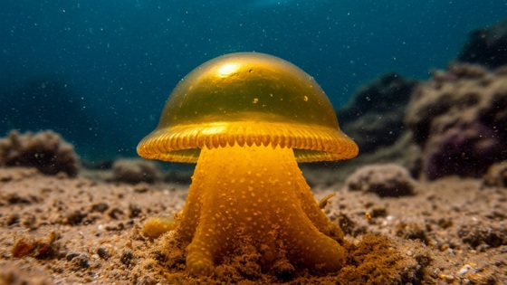 Во время исследования океанского дна у побережья Аляски научная экспедиция NOAA совершила неожиданное открытие. На глубине 3300 метров подводный робот обнаружил странный золотистый объект, плотно прикрепленный ко дну. Его необычная куполообразная форма с отверстием у основания сразу исключила принадлежность к известным классам морских организмов — это не рыба, не губка и не коралл.