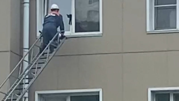 Специалисты МЧС незамедлительно начали спасательную операцию. Однако им мешали припаркованные машины, из-за которых спецтехнике было трудно подъехать ближе к дому. Вскоре по выдвинутой лестнице спасатель смог добраться до животного и успешно затолкать его обратно в квартиру.