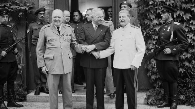 Участники Потсдамской (Берлинской) конференции (слева направо): премьер-министр Великобритании Уинстон Черчилль, президент США Гарри Трумэн, глава правительства СССР Иосиф Сталин