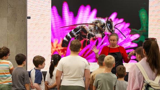 В это время в павильоне «Цветоводство и озеленение» развернулась просветительская программа. В одной из лабораторий заведующая научно-экспозиционным отделом Биомузея Маргарита Атрощенко рассказала о пчелах и целебных свойствах меда. У большого экрана с изображением пчелы на цветке расположился демонстрационный рамочный улей, тут же на столе представлены дымарь, защищающий пчеловода от его питомцев, и образцы продуктов: соты, перга, прополис и, конечно же, разные виды меда: липовый, цветочный, гречишный и разнотравный.