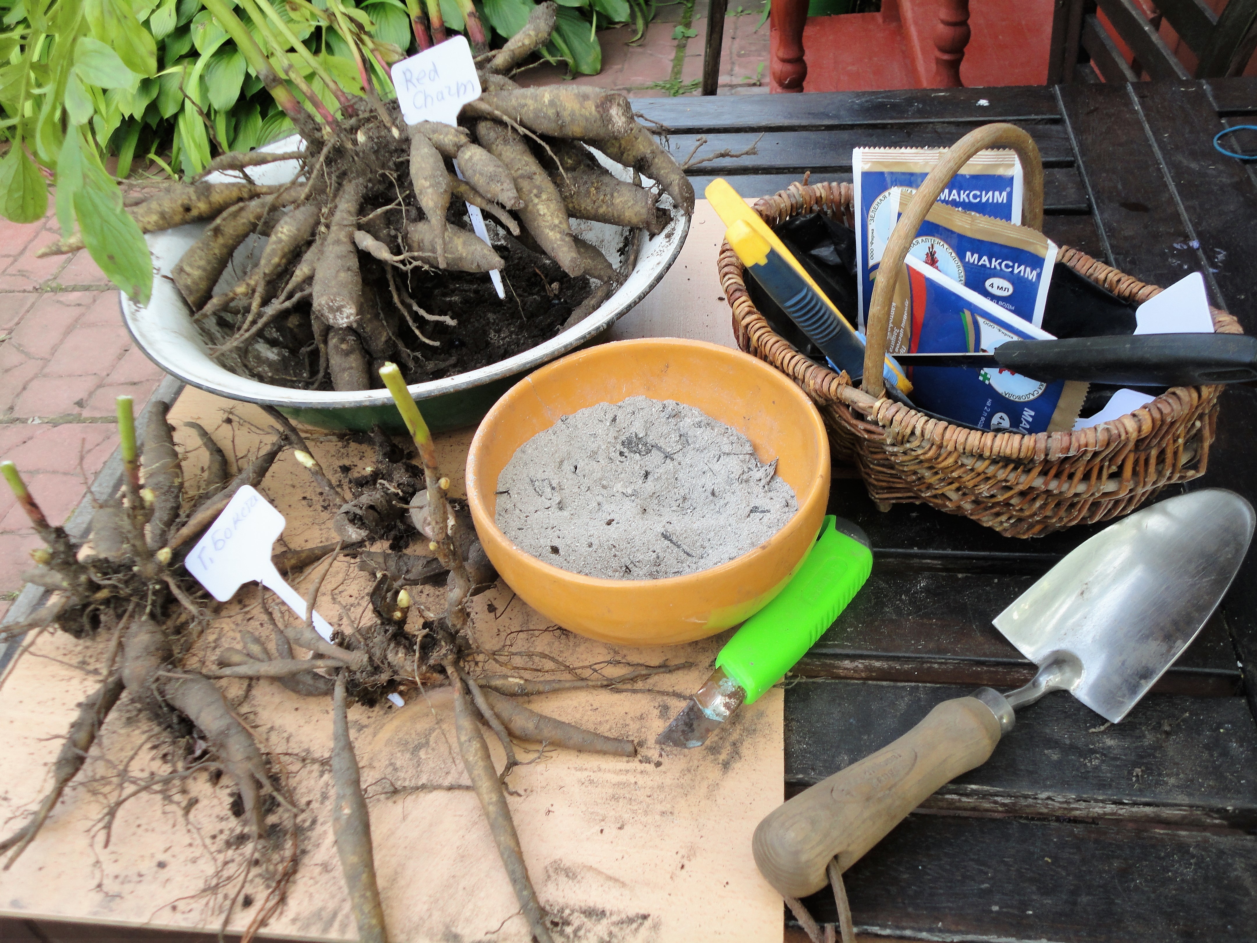 В ходе этой процедуры вы имеете возможность санировать корни, удалив все старые, отслужившие свое, подгнившие или пораженные кавернами. Оставшиеся надо поделить и деленки высадить на новое место. Прежде чем это сделать, следует подержать корни в дезинфицирующем растворе марганцовки или препарата «Максим». О технике деления старых кустов и посадки пионов более подробно я писала в статье