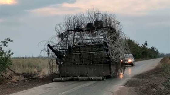 Кроме того, была применена колючая проволока. На крыше установили расплетенные стальные тросы и средства радиоэлектронной борьбы. Впереди имеется импровизированный минный трал.
