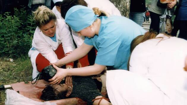 Продавщица Галина Скокова бросается к входу в магазин и закрывает дверь, чтобы не впустить огонь. Вместе с покупательницей и ее детьми она инстинктивно бросается к окну — но на нем глухая решетка, которую не удается сорвать. Оказавшиеся в ловушке женщины готовятся к самому худшему.