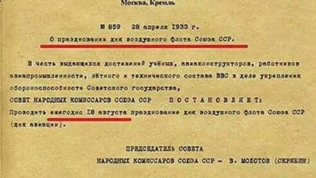 В 1933 году постановлением Совета народных комиссаров была назначена новая дата празднования Всесоюзного дня авиации (Дня воздушного флота СССР). Следует отметить, что аналогичный праздник был учрежден императором Николаем II, а в 1924 году эту традицию продолжил военачальник Михаил Фрунзе.