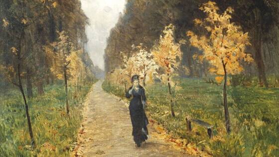 Осень уже вовсю хозяйничает в парке. Холодно, светло и грустно. Жухлые листья кленов усыпали теряющуюся в дымке пустынную аллею, по которой идет погруженная в свои мысли девушка в черном платье. Какая-то бесприютность и сплошное экзистенциальное одиночество.