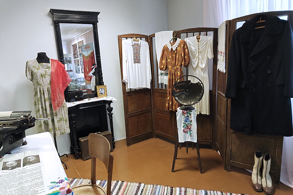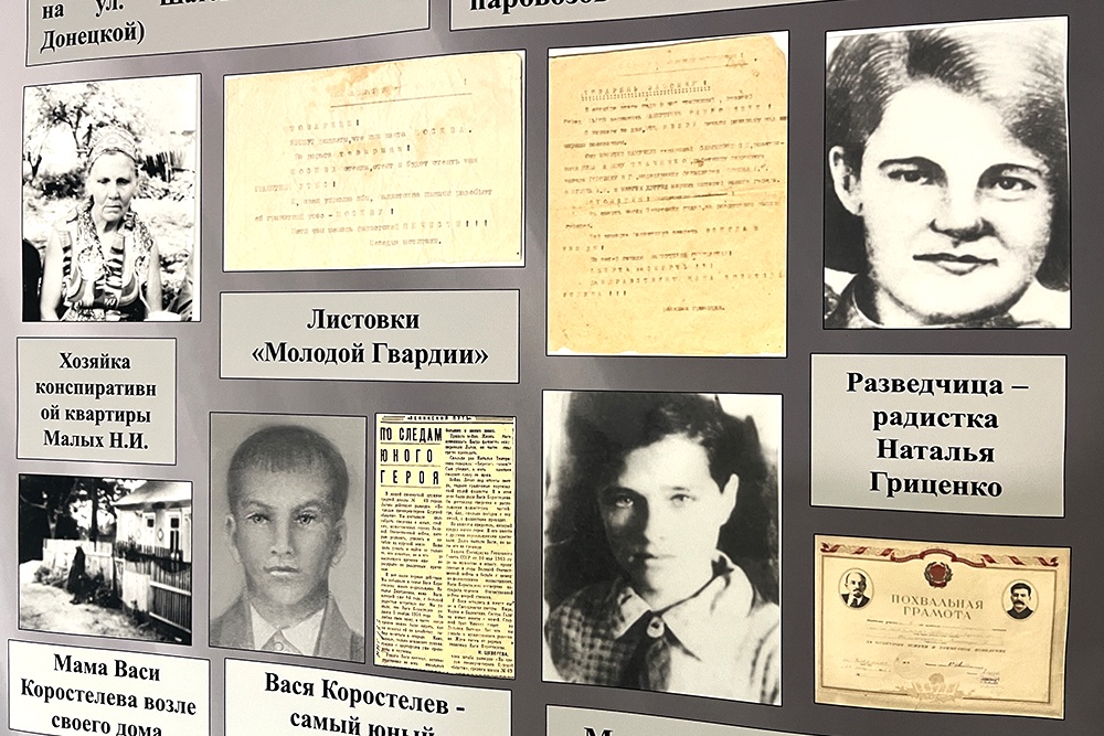 Здесь есть рубашка одного из подпольщиков, с вышиванкой - тут всегда в таких ходили, патефон, печатная машинка. Примерно как в квартире Ильяшовой. За стеклом - "ЧГ". И фотографии мальчишек и девчонок. Кто-то улыбается, кто-то хмурится.