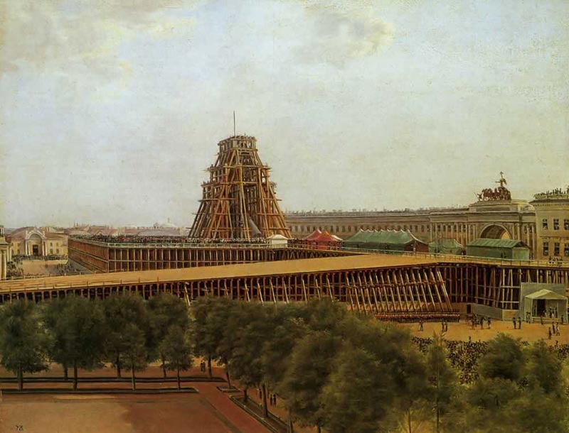 Были в альбоме и рисунки колонн-обелисков. Этот альбом и приведет архитектора в Россию. По другой версии в Россию Монферран попадет после знакомства с Николаем Демидовым, который и поможет перебраться.