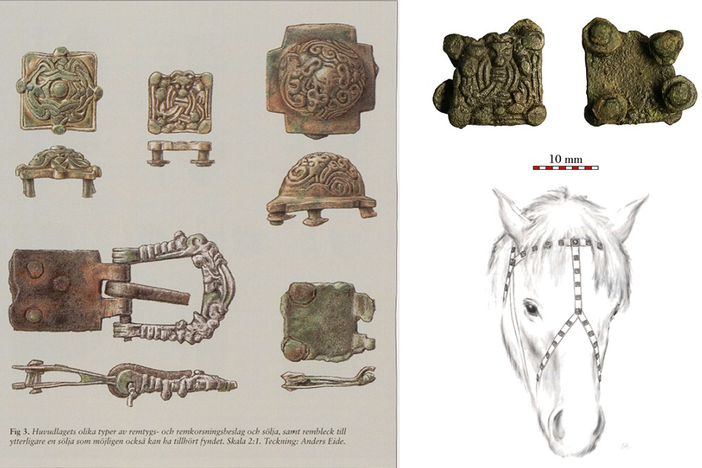Еще один ценный предмет - металлическая накладка на уздечку верхового коня. Она украшена в североевропейском стиле Борре. Точно такие декоративные бляшки были в свое время обнаружены в Средней Швеции в погребении первой половины X века. Чем можно объяснить эту параллель? Ученые предполагают, что смоленская находка - часть той же сбруи, что была зарыта в шведском Уппланде. Возможно, владелец уздечки (или его конь) бывали в Гнездове и обронили там эту маленькую деталь.