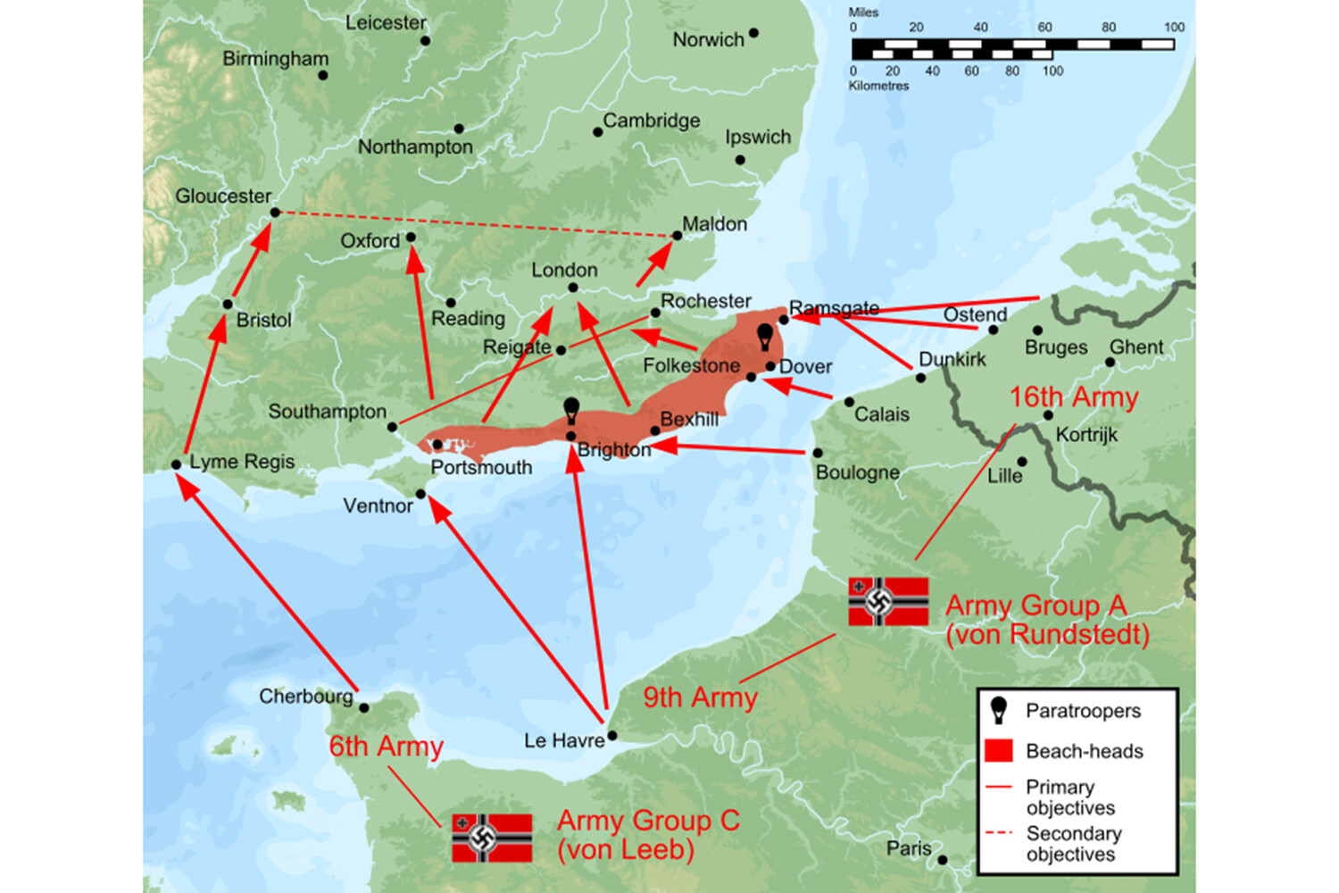 Высадка прошла в графстве Кент. 8 тысяч парашютистов и 80 тысяч пехотинцев закрепились на берегу и захватили города Фолкстон и Ньюхейвен. Поскольку по воде им предстояло преодолеть лишь около 40 километров, значительная часть войск ехала на импровизированных баржах, а не на десантных судах, которых у Германии не было. Сразу же в воздухе развернулось решающее сражение, в котором каждая из сторон потеряла за первый день 23% своих самолетов.
