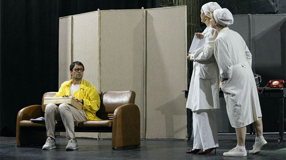 Большую часть сценического действия Чуковский проводит в маске, нарочито условной, с карикатурно большим носом и густыми бровями. Кажется, еще чуть-чуть — и она упадет сама. Сцена, в которой зритель наконец видит настоящее лицо писателя, производит оглушительный эффект.