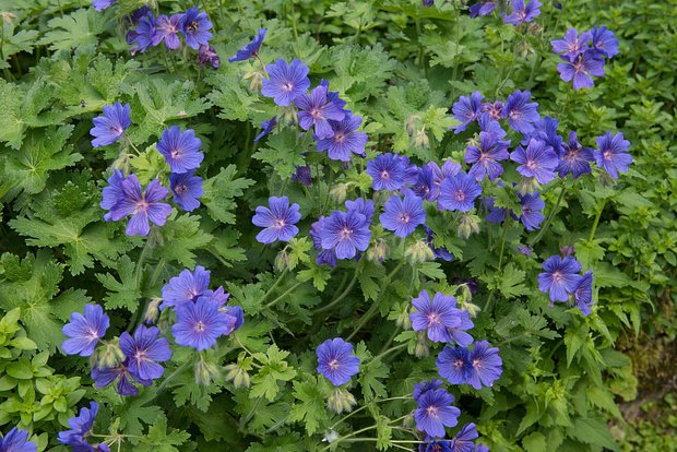 Например, невысокие почвопокровные виды (гималайская, кантабрийская, пепельная герань) можно использовать для того, чтобы скрыть непрезентабельные участки. Они хорошо разрастаются и образуют своеобразный цветущий газон.