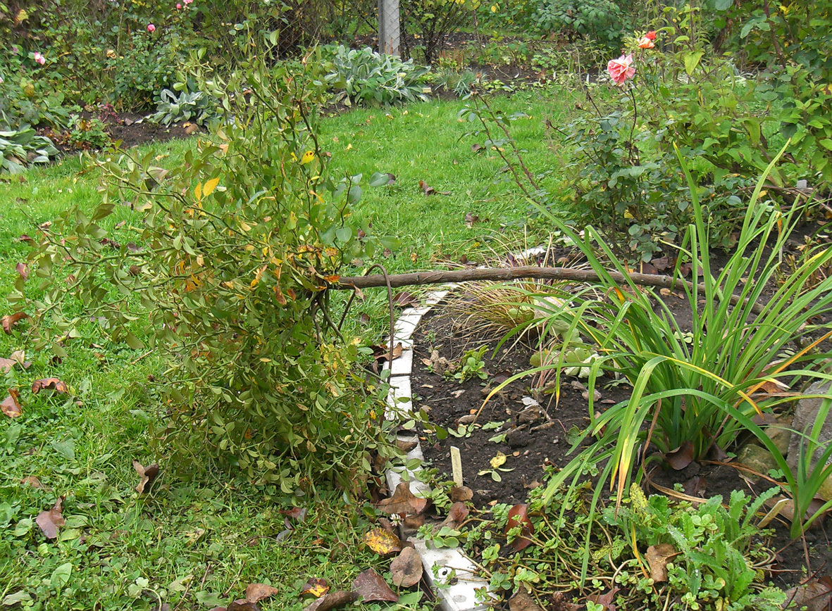 Пригибать штамбы начинаю рано — так, чтобы укрыть их к началу ноября. Если остальные розы ещё могут подождать, то штамбы, я считаю, лучше укрывать пораньше. Для начала отвязываю от опоры в сентябре, пусть привыкает к наклонному положению. Через пару недель приступаю к пригибанию. Берусь за макушку штамба и, раскачивая осторожно вверх-вниз (по типу маятника), постепенно наклоняю к земле. Насильно гнуть не надо, не торопитесь, за пару выходных вы успеете подтянуть штамб пониже. Фиксирую наклонное положение гнутым прутком. И оставляю в таком положении на некоторое время.