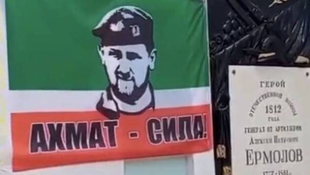 В Орле на могиле российского полководца Алексея Ермолова, воевавшего с чеченцами в Кавказской войне 1817-1864 годов, повесили флаг с портретом главы Чечни Рамзана Кадырова. Ролик с места захоронения опубликовал общественник и спортсмен Максим Дивнич в Telegram.