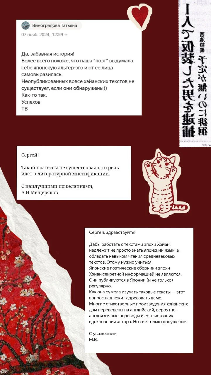 Чуть больше года назад, в сентябре 2024 года, автор телеграм-канала "Ленивый прокрастинатор" купила сборник танка "Поведал странник" японской поэтессы XI века Юми Каэдэ. К слову, покупка пришлась по вкусу. Автор канала, которую зовут Эмма, оценила "красивый слог стихов". Стала искать информацию о поэтессе, но ничего не нашла, кроме того, что переводом занималась некая Мария Похиалайнен. Еще через месяц одна из подписчиц телеграм-канала Эммы написала, что весь этот сборник — "фейк". С этого началось большое расследование, которое продлилось почти год и оформилось в довольно увлекательный лонгрид.