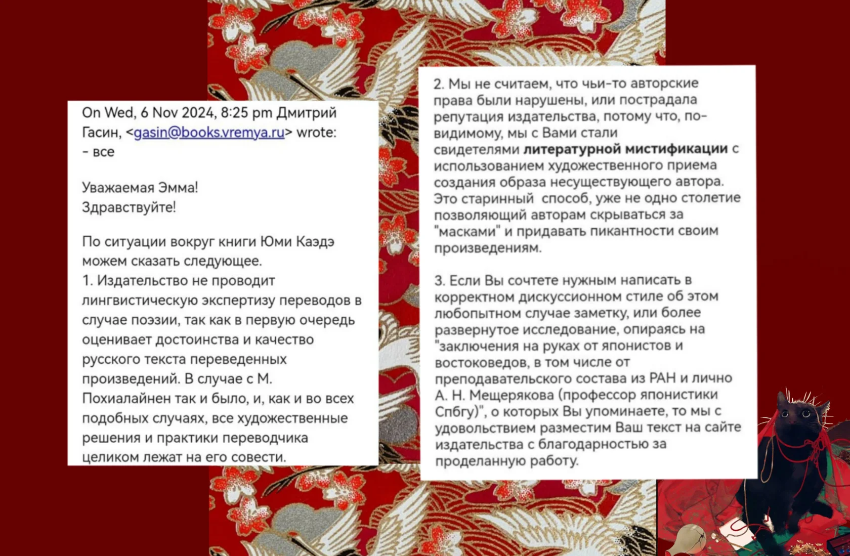 А что издательство? Сборник "Поведал странник" вышел в издательстве "Время" в 2013 году и спокойно продавался более 10 лет. В попытках узнать, кто такая Юми Каэде, Эмма писала в том числе издательству. Ответ пришел не сразу, а только спустя несколько месяцев, в ноябре 2024 года. Менеджер Дмитрий Гасин указал, что издательство не видит в публикации сборника нарушение чьих-либо авторских прав или что от этого пострадала репутация издательства. "Мы с Вами стали свидетелями литературной мистификации (выделено Дмитрием Гасиным в письме, — прим. ред.) с использованием художественного приема создания образа несуществующего автора. Это старинный способ, уже не одно столетие позволяющий авторам скрываться за "масками" и придавать пикантности своим произведениям", — написал представитель издательства. На сайте, где описано расследование, Эмма назвала такую мистификацию "чушью", заявила, что "издательство совершило грубую ошибку", напечатав "гарант-фальсификацию".