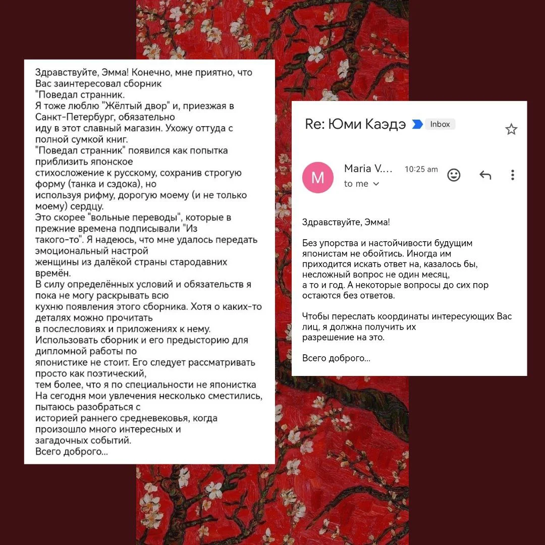 Эмме все-таки удалось выйти на переводчицу Марию Похиалайнен. Девушка написала ей письмо, представившись студенткой-японисткой СПбГУ. Мария ответила, что она "по специальности не японистка" и не рекомендует "использовать сборник ["Поведал странник"] и его предысторию для дипломной работы". "Поведал странник" появился как попытка приблизить японское стихосложение к русскому, сохранив строгую форму (танка и сэдока), но используя рифму, дорогую моему (и не только моему) сердцу. Это скорее "вольные переводы", которые в прежние времена подписывали "Из такого-то". Я надеюсь, что мне удалось передать эмоциональный настрой женщины из далекой страны стародавних времен", — написала в письме переводчица. А также добавила: "В силу определенных условий и обязательств я пока не могу раскрыть всю кухню появления этого сборника".