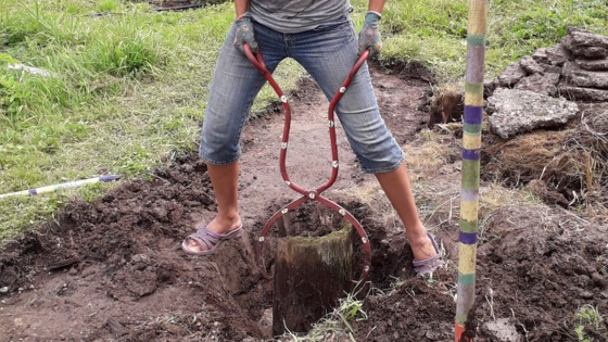 Затем с помощью лопаты убрала землю вокруг столбика.
