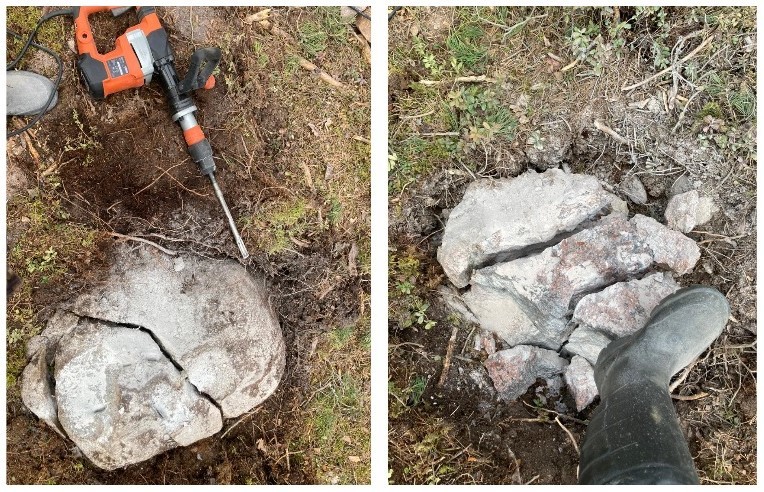 Этот инструмент безотказен, и именно им мы пользуемся чаще всего и как правило. Процесс выкатывания «двуломников» занимает 1,5-2 часа. Небольшие валунчики — 10-30 минут. В общем, все зависит от размера клиента.