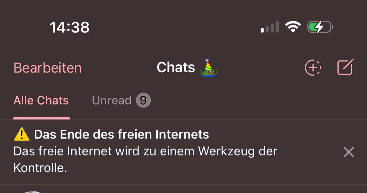 Интересно, что плашка «Конец свободного интернета», ведущая к этому посту, появилась в Telegram только у пользователей из ЕС (на скриншоте аккаунт с немецкой SIM-картой). Некоторые СМИ пишут, что они замечены у людей из Италии, Испании, Германии и Финляндии.