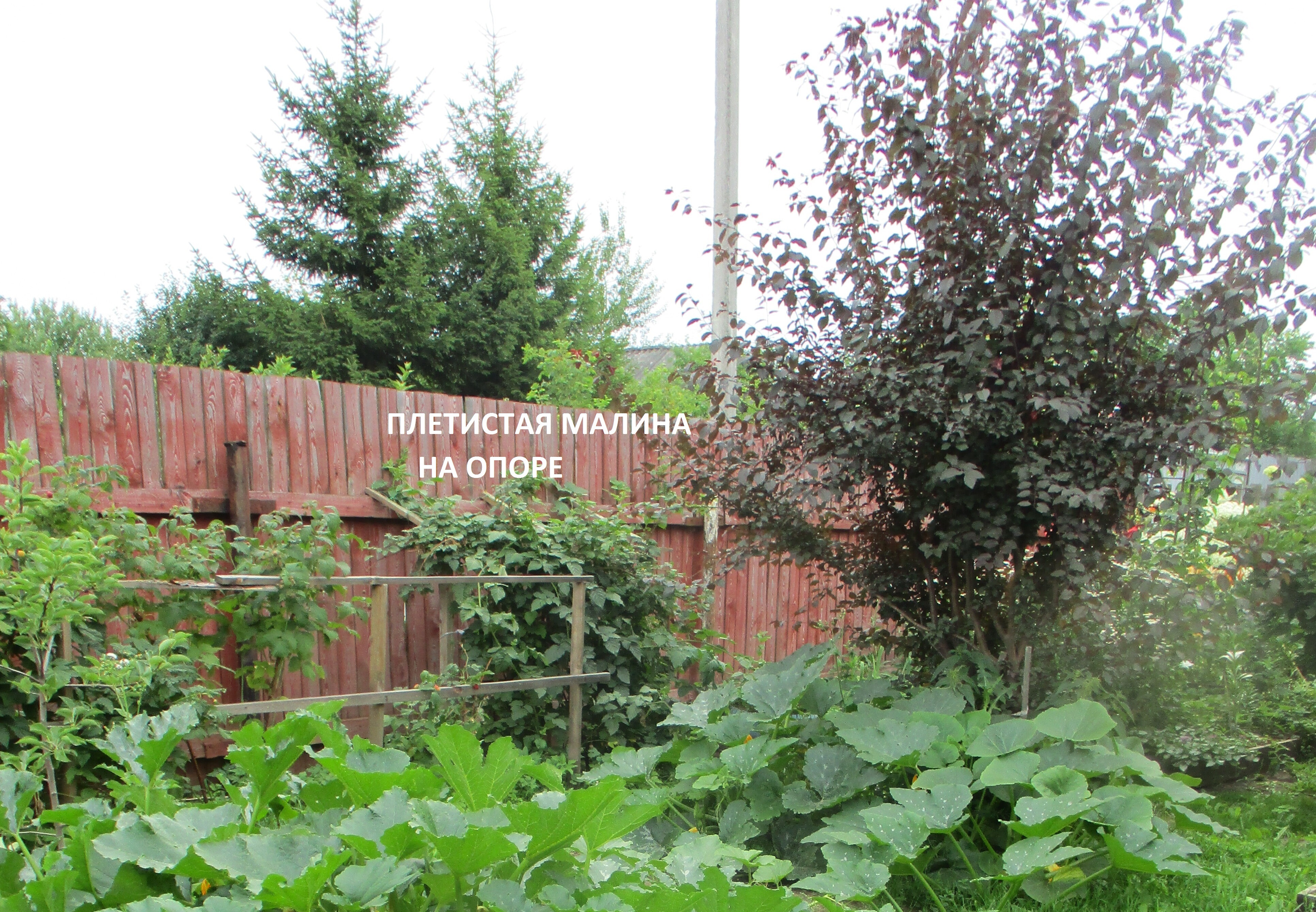 Два кустика плетистой (крупной). В этом году весной сделали для нее опору на заборе, раньше малина просто расползалась. Ее я стараюсь не обрезать — чем больше ее обрезаешь, тем она больше разрастается.