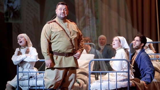 Пятнадцать песен, звучащих в спектакле, созданы Сергеем Жуковым. В Губернском театре он впервые играет на сцене как актер: его герой - артист, приехавший к раненым в госпиталь. Жуков признается: "Для меня стало открытием, что самыми сложными композициями оказались веселые песни. Да, идет война, но жизнь продолжается, в ней есть по-прежнему любовь, минутное счастье, желание жить. Это такая тонкая работа - передать все тонкие оттенки чувств, которыми люди живут на фоне ужасов войны. Но именно эти моменты и дают спектаклю остроту".