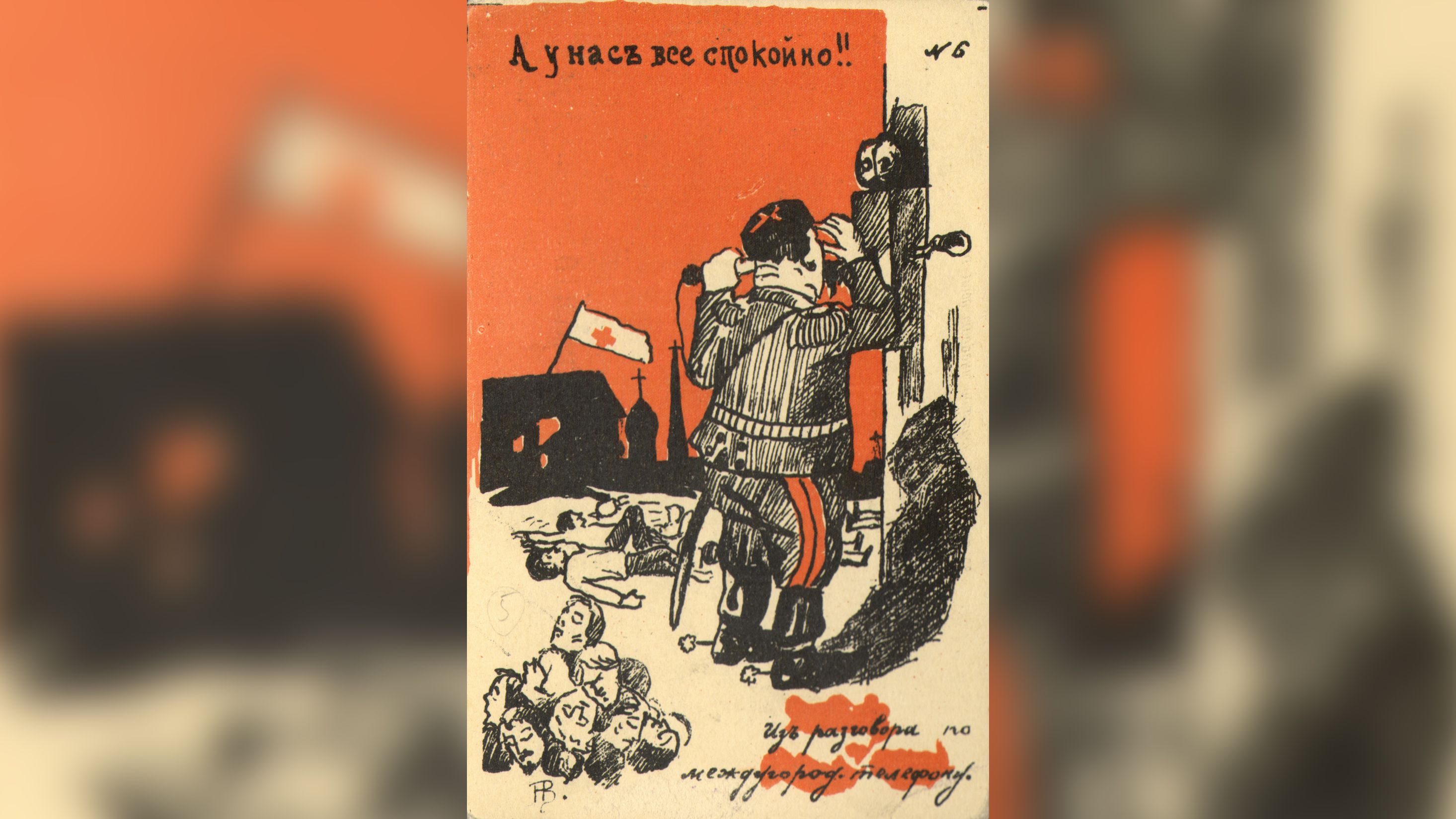 Например, открытка «А у нас все спокойно!! ярко отражает события того времени. Кто-то из представителей высшего офицерского состава докладывает по междугороднему звонку (как поясняет надпись внизу), что в городе порядок. Но мы-то видим, что рядом с ним творится. Гора из человеческих голов прямая аллюзия на известную картину Василия Верещагина «Апофеоз войны, написанную еще в 1871 году. И хотя полотно отсылало к событиям XIV века, можно уловить тонкий намек: в наступившем ХХ столетии жертв правящего класса меньше не стало.