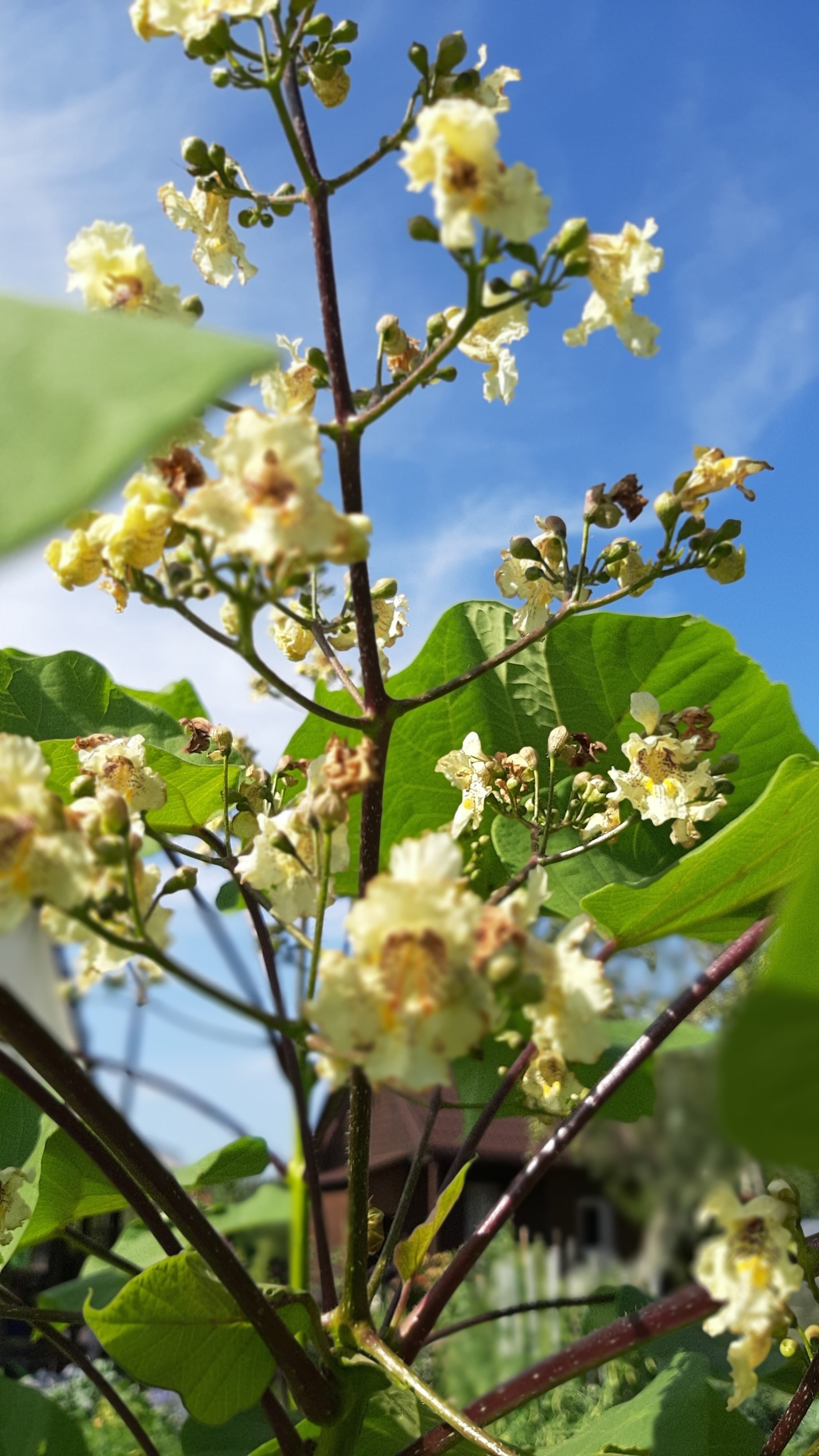 сравнивается с ванилью, медом и отдаленным ароматом жасмина… Ну, не знаю, для меня это — просто запах моей катальпы! Отцветшие цветоносы я, по обыкновению, удалила — как у сирени, например. Поэтому в том году плодов не видели… Кроме того, начала формирование кроны — когда наросли новые, удалила и ту нижнюю ветку (
