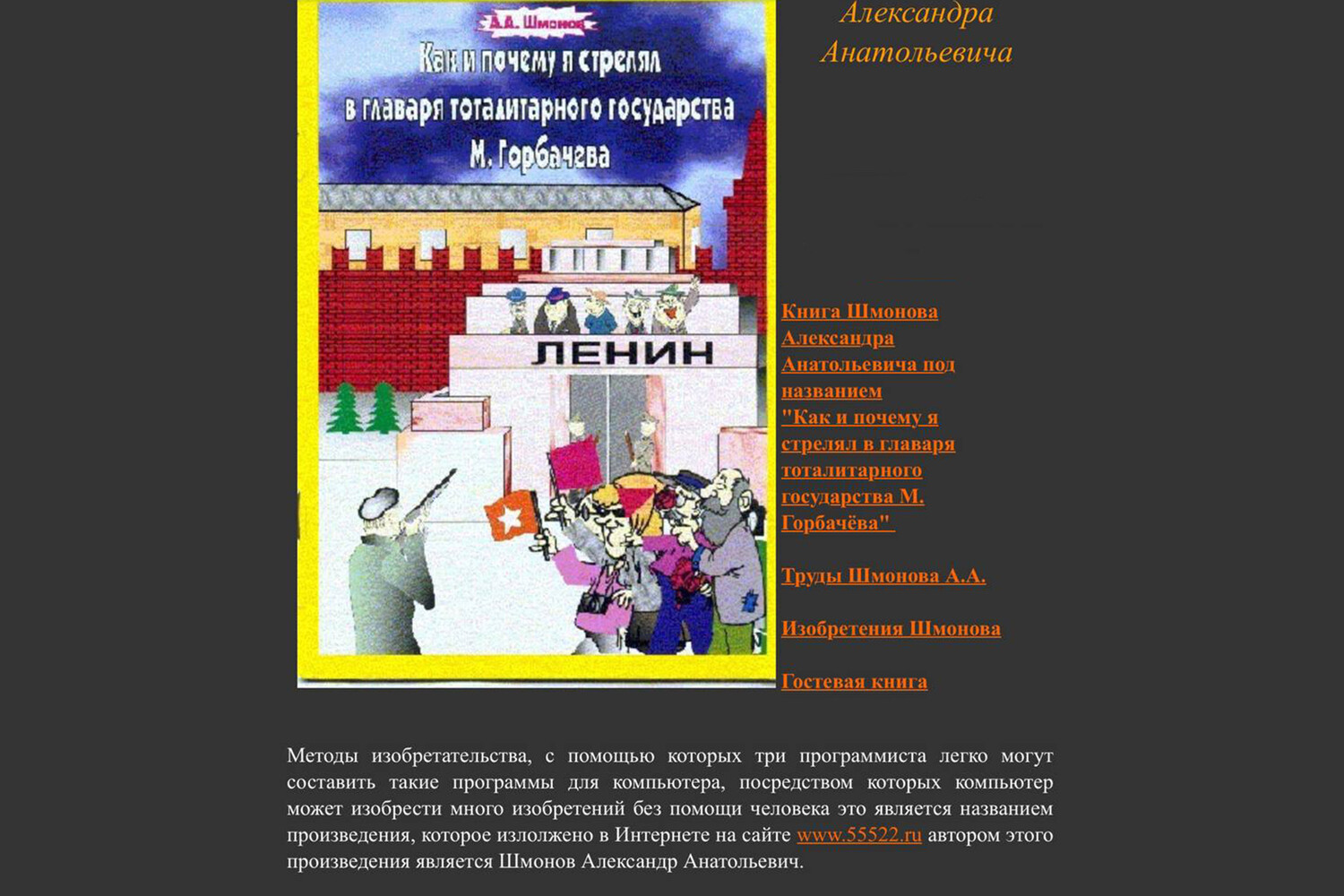 Сейчас же он жив и находится на восьмом десятке, публичную деятельность не ведет. Зато неудавшийся убийца ударился в изобретательство: предложил технологию избавления от пробок в городах, подавления индустриального шума, а также алгоритм написания «программы для компьютера, посредством которых компьютер может изобрести много изобретений без помощи человека», руками всего лишь трех программистов.