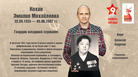 «В августе 1941 года после окончания девятого класса бабушка пошла в армию добровольцем, хотя ей не было еще 17 лет. Отучилась в радиошколе, потом в школе младших командиров. Была гвардии младшим сержантом, служила радисткой. Воевала на Карельском перешейке, в Заполярье, Норвегии, Польше, Германии.