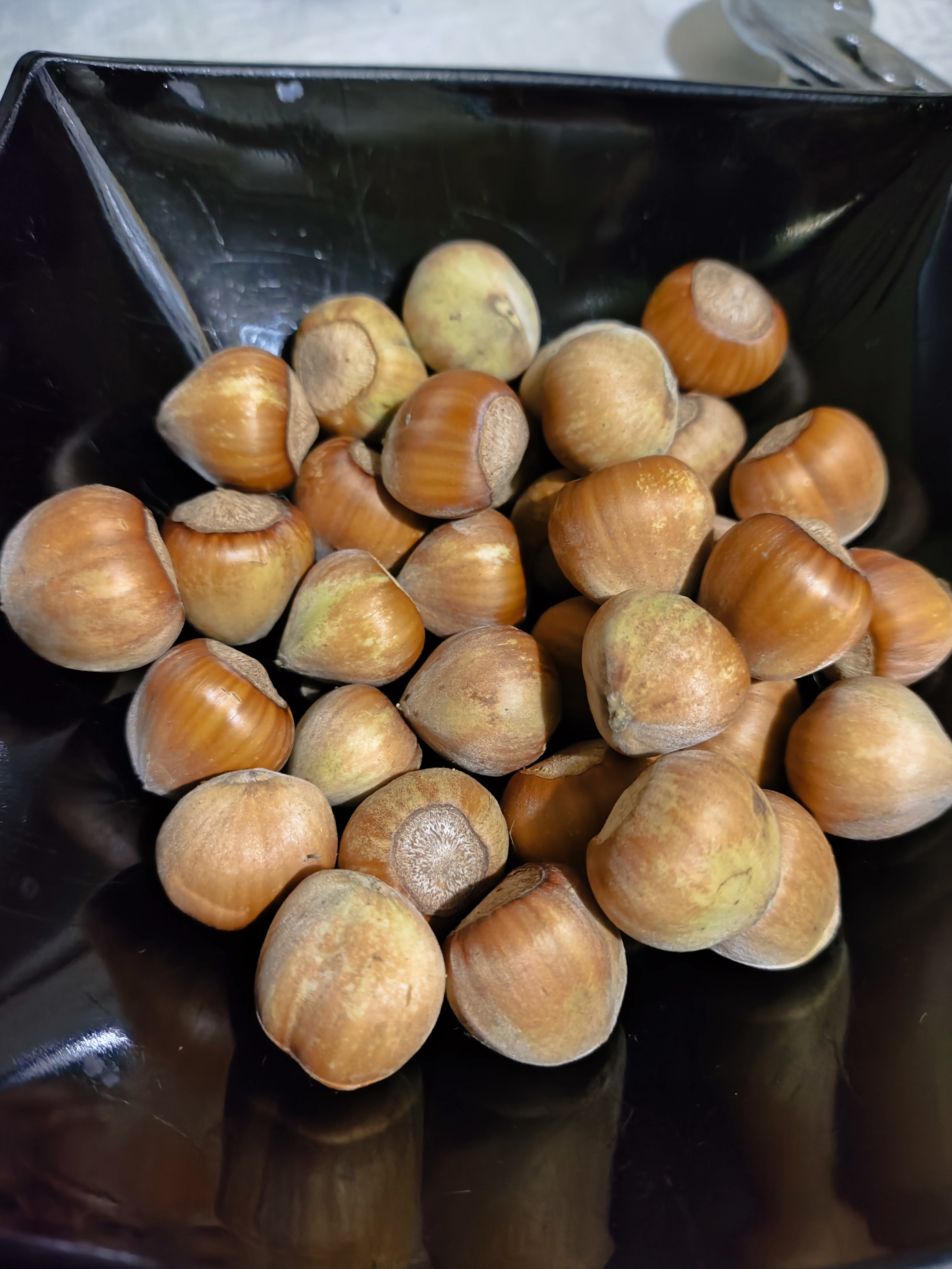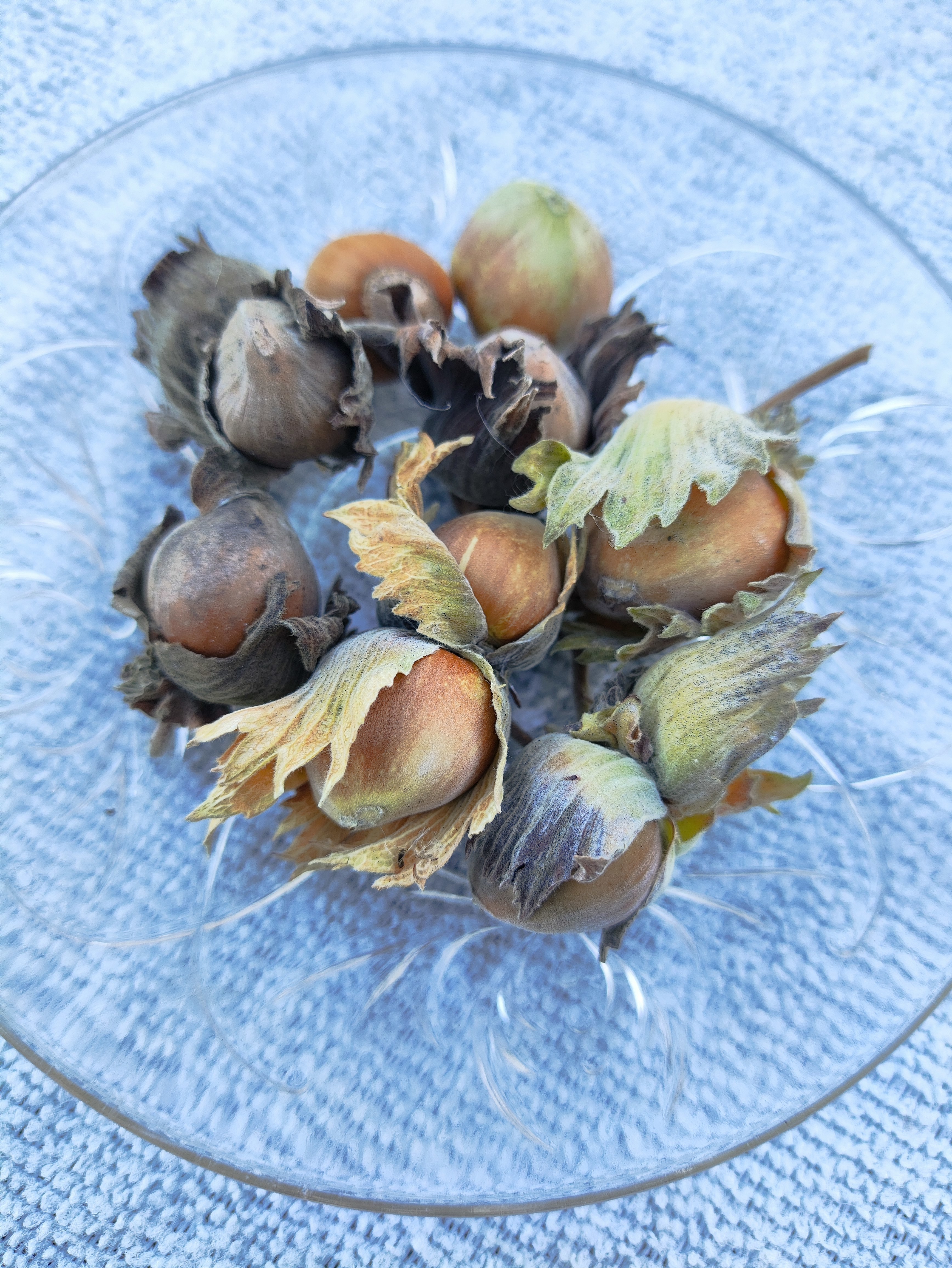 Однажды, придя в огород, я этих трех орешков не увидела. Расстроилась, так как беглый, а потом и внимательный взгляд под куст не дал результата. Пошла поработала. И проходя в очередной раз мимо, увидела свои орешки под кустом. Они так не хотят, чтобы их нашли, и очень профессионально маскируются под жухлую листву. Подошла подобрать, увидела еще. Другие орешки. А потом и еще, и еще!!! А потом и на кусте разглядела несколько штук. Куст сбросил листву, и их стало проще разглядетьСобрала полгорсточки, на ветках оставила.