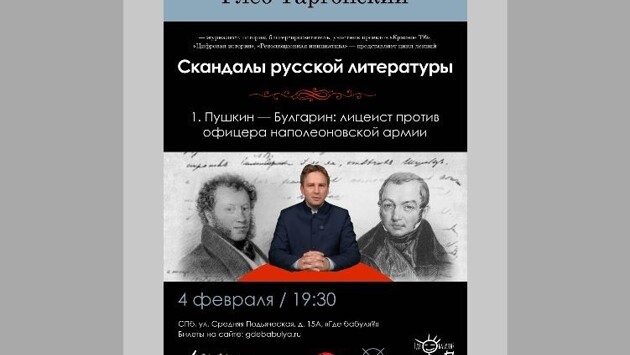 "ХЧ лекторий" и культурное пространство "Где бабуля?" (Санкт-Петербург, ул. Средняя Подьяческая, дом 15, литера А) приглашают 4 февраля в 19:30 на первую лекцию из цикла историка литературы Глеба Таргонского "СКАНДАЛЫ РУССКОЙ ЛИТЕРАТУРЫ" ! Лекция первая: "Пушкин — Булгарин: лицеист против офицера наполеоновской армии". Один, будучи лицеистом, приветствовал победы русского оружия над Наполеоном, другой верой и правдой Наполеону служил. Они сошлись, "как лед и пламень", а разошлись, как непримиримые враги. Два писателя, два литературных "бизнесмена" Золотого века русской литературы: Фаддей Булгарин и Александр Пушкин. Мы узнаем о том, как они дружили и как разругались между собой. Украл ли Булгарин у Пушкина сюжет "Бориса Годунова"? Какие литературные скандал сотрясали Петербург начала 19 века? Почему Пушкин называл Булгарина фамилией создателя французского уголовного розыска, и почему это было ругательство? Как Фаддей Булгарин пытался отомстить покойному Пушкину? Об этом и о многом другом в лекции известного историка и просветителя Глеба Таргонского! Подробности в соцсетях проекта "ХЧ лекторий" . Информационная поддержка: портал о культуре "Ревизор.ru", еженедельник "Литературная Россия".
