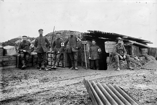 «Медицинская служба германской армии комплектовалась военными врачами. Военные врачи имели звание от врача Генерального штаба (General-Stabs-Arzt) до врача-ассистента (Assisten Arzt) и одногодичного врача (Einjaehrige Arzt). Нижние чины медицинской службы обычно именовались Sanitaets-Mannschaften и служили в госпиталях санитарами и носильщиками. Полевая медицинская служба состояла из полковой медицинской службы, рот носильщиков, полевых госпиталей, автомобильных санитарных колонн и передовых армейских медицинских складов. Обычно в каждом батальоне имелось два офицера медслужбы и четыре унтер-офицера (в мае 1916 года унтер-офицеров стало пять). Носильщики комплектовались из числа негодных к строевой службе. Их можно было отличить по белой нарукавной повязке с красным крестом, которую носили на левом рукаве», — писал в книге «Германская Армия. 1914-1918» исследователь Дональд Фостен.