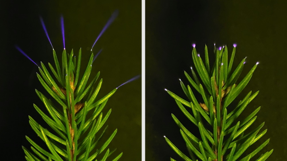 Коронный разряд возникает, когда накопленный в облаках электрический заряд индуцирует противоположный заряд на земле. Электричество стремится к самой высокой точке — в лесу это верхушки крон и острые края листьев. Лабораторные опыты десятилетиями намекали на существование этого процесса: в полной темноте ученые наблюдали слабое фиолетово-голубое сияние вокруг растений. Однако зафиксировать это в дикой природе мешали дневной свет и даже сумрак грозового неба, который на порядки ярче слабых вспышек короны.