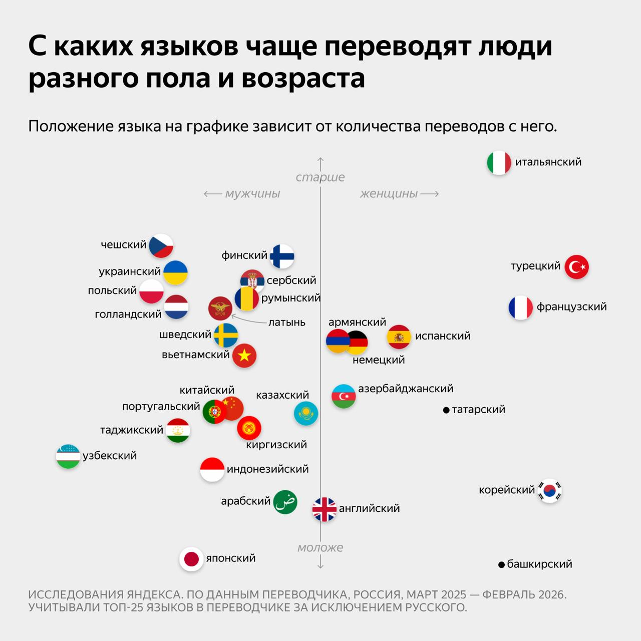 Различаются и предпочтения по возрасту. Подростки до 18 лет чаще других переводят с башкирского, японского, корейского и арабского. Пользователи 25−34 лет лидируют по переводам с узбекского, таджикского и азербайджанского. Люди старше 45 лет проявляют повышенный интерес к итальянскому и испанскому.
