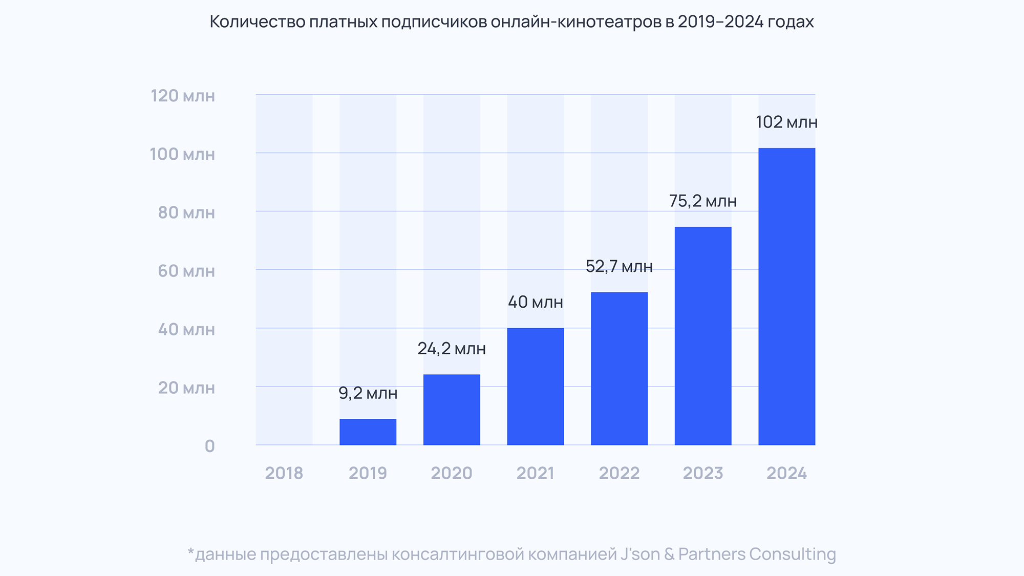 Рост продолжился и в 2021 году. По данным J’son & Partners Consulting, количество платных подписчиков онлайн-кинотеатров выросло до 40 миллионов. Выручка онлайн-кинотеатров увеличилась до 72,6 миллиарда рублей — на 46%.