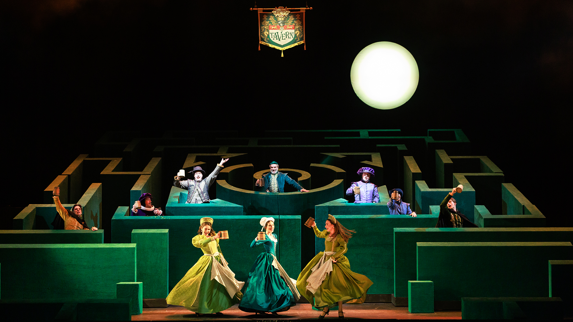 Другим центральным героем можно назвать гигантский лабиринт из зелёной растительности во всю сцену. Он имитирует английский сад и становится символом хитросплетения сюжетных линий. Кроме сценографии лабиринт влияет на динамику: актёры появляются и исчезают в нём, иногда превращают его в настоящий портал, обыгрывая отправку корреспонденции, а порой и вовсе блуждают, порождая очередные забавные ситуации. Создатели наделили лабиринт волшебными чертами: при луне он меняет цвет, слышатся странные звуки — всё это имитирует погружение в сказки и легенды, где происходят самые невероятные события.